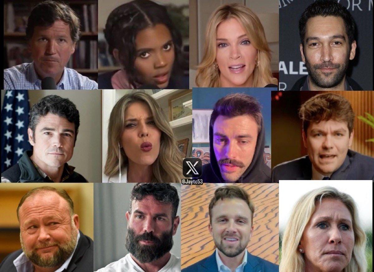 Alex Jones, Alex Stein, Ana Kasparian, Ann Coulter, Ann Vandersteel, Benny Johnson, Brandon Straka, Bret Weinstein, Brian Glenn, Brit Hume, Candace Owens, Catherine Fitts, Cenk Uygur, Dave Rubin, Dave Smith, Dom Lucre, Douglas MacGregor, Emerald Robinson, Enrico Tarrio, Eric Bolling, George Webb, Glenn Greenwald, Grace Chong, HealthRanger, HodgeTwins, Ian Carroll, Ian Miles Cheong, InTheMatrix, Ivan Raiklin, Jack Posobiec, Jeff Carlson, Jesse Kelly, Jesse Ventura, Jake Shields, Jenna Ellis, Joe Kent, Joe Rogan, Jon Herold, Jordan Sather, JP Sears, Julie Kelly, Judge Napolitano, Justin Amash, Kanekoa, Lara Logan, Laura Loomer, Lauren Boebert, LHGrey, Lisa Mei, Liz Crokin, Mario Nawfal, Marjorie Taylor Greene, Mark Mitchell, Matt Gaetz, Matt Walsh, Matthew Tyrmand, Megyn Kelly, Michael Flynn, Michael Flynn Jr., Mike Cernovich, Miles Guo, Milo Yiannopoulos, MJTruth, Myron Gaines, Nick Fuentes, Nick Sortor, Owen Shroyer, Patrick Byrne, Patriot Voice, Paul Joseph Watson, Peter Schiff, Piers Morgan, Praying Medic, Raheem Kassam, Rand Paul, Ron Paul, Richard Baris, Robert Barnes, Russell Brand, Savannah Hernandez, Shannon Bream, Shawn Ryan, Steve Bannon, Stew Peters, Tate Bros, Theo Von, Thomas Massie, Tim Dillon, Tim Pool, Tracy Beanz, Tucker Carlson, WeTheMedia, Xe and more...