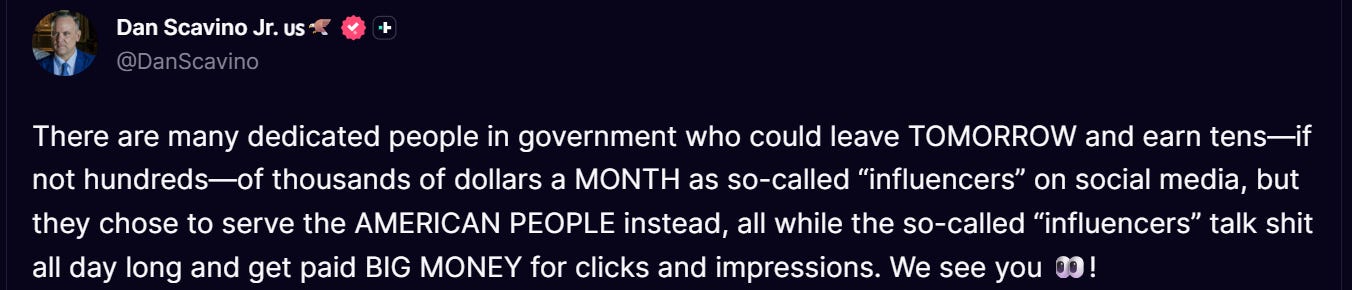 DAN SCAVINO: “There are many dedicated people in government who could leave TOMORROW and earn tens—if not hundreds—of thousands—of dollars a MONTH as so-called ‘influencers’ on social media, but they choose to serve the AMERICAN PEOPLE instead, all while the so-called ‘influencers’ talk shit all day and get paid BIG MONEY for clicks and impressions. We see you!”