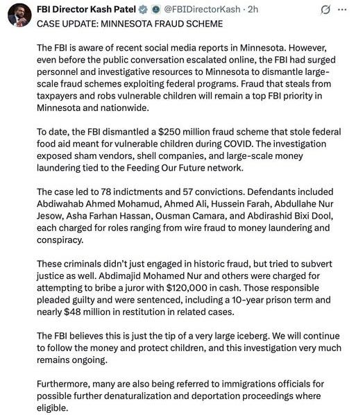 Kash is right. Team Trump has been on the ground in Minnesota rounding up the fraudsters for months and many of them tie directly to the top!