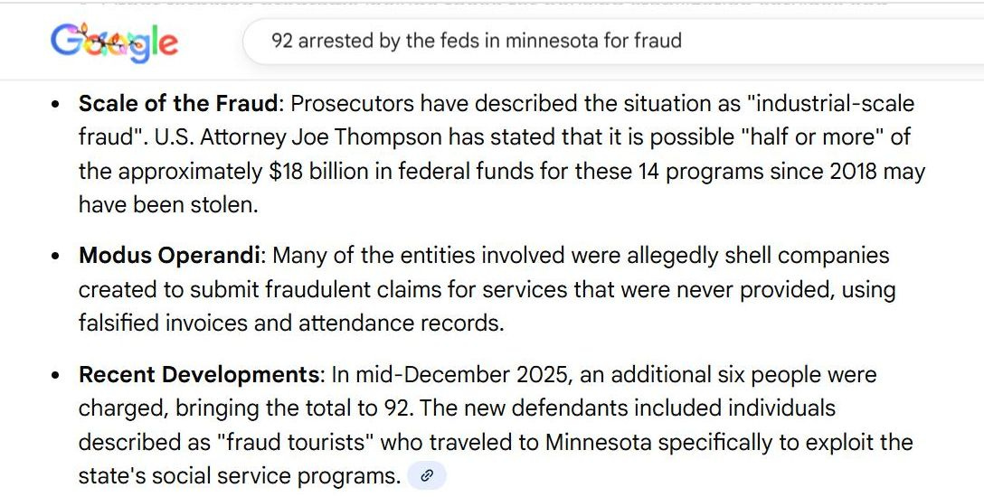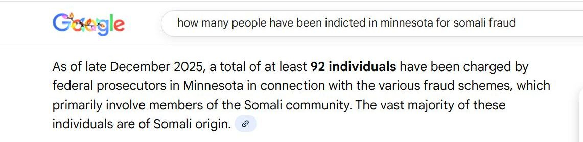 The Trump administration and AG Pam Bondi have FEDERALLY indicted 92 people in Minnesota for the Somali fraud, are deporting them and also stopped their protected status. 6 more people were just indicted and arrested last week by Team Trump. They also met with reporter Nick Shirley two months ago at the White House and sent him to Minnesota to film it and asked Elon to expose his work on X.