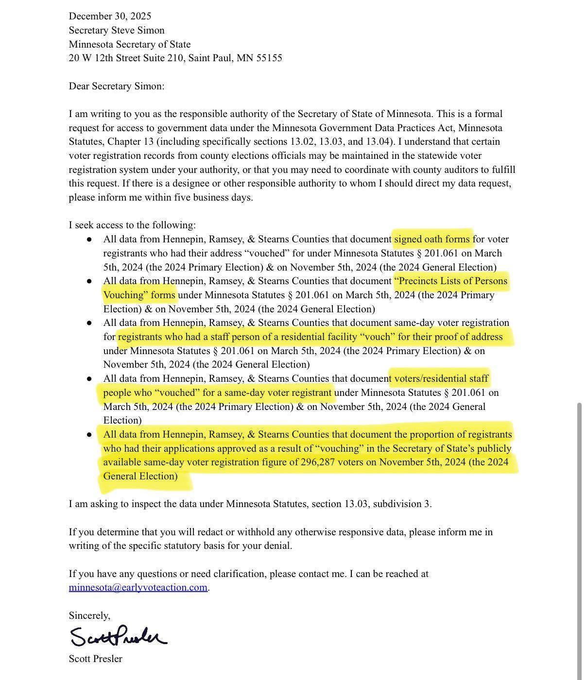 Scott Pressler is asking Minnesota Secretary of State Steve Simon for voting records confirming “vouching.” In Minnesota, as I said earlier, you don’t have to prove you’re a citizen or a resident. You just have to find somebody who will “vouch” for you!