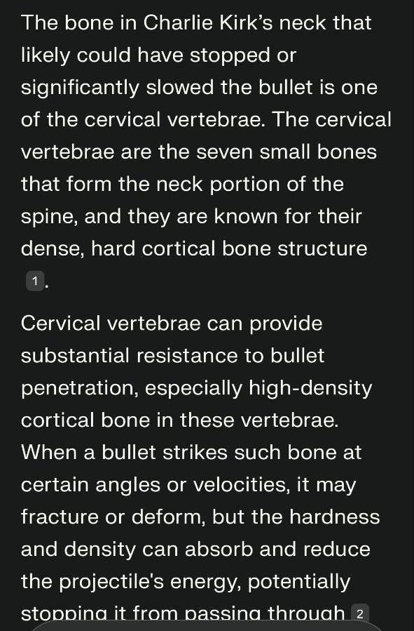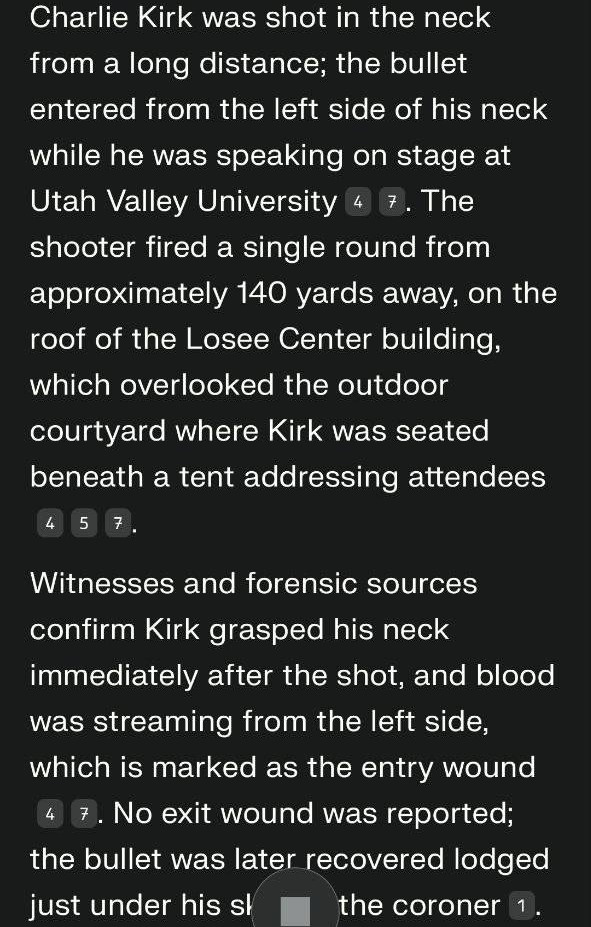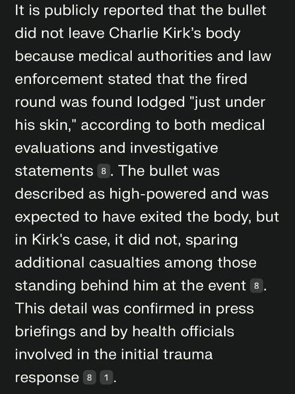 TPUSA and the media are going with the theory that the shot came from 140 yards away from a Mauser 30.06 and penetrated the neck but was stopped by bone and lodged next to the skin and that Charlie is a MAN OF STEEL. This narrative doesn’t seem logical to me at all. This is only 15 minutes long and it’s the best summary I’ve seen of where we are at regarding Charlie’s murder...without hyperbole and clickbait hysteria. It’s worth your time.