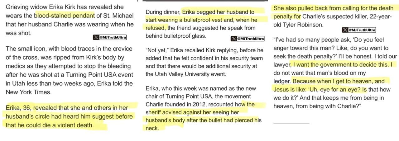 Erika Kirk said there are so many "theories" floating around about Charlie that she is doing a show next week on them all. She confirmed that Charlie was NOT wearing a bullet proof vest - that he was confident in his security team at UVU - and that she does not want the death penalty for Tyler and that she “forgives him” for his knows not what he’s done.
