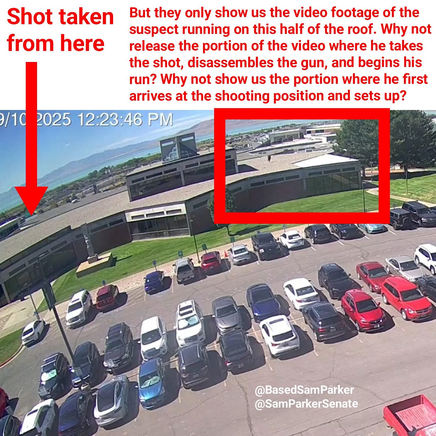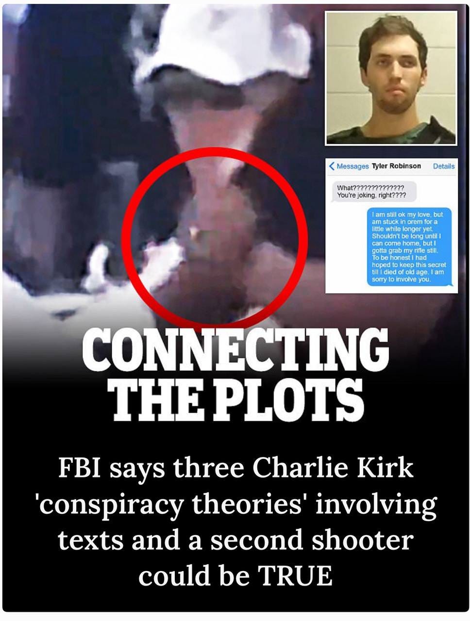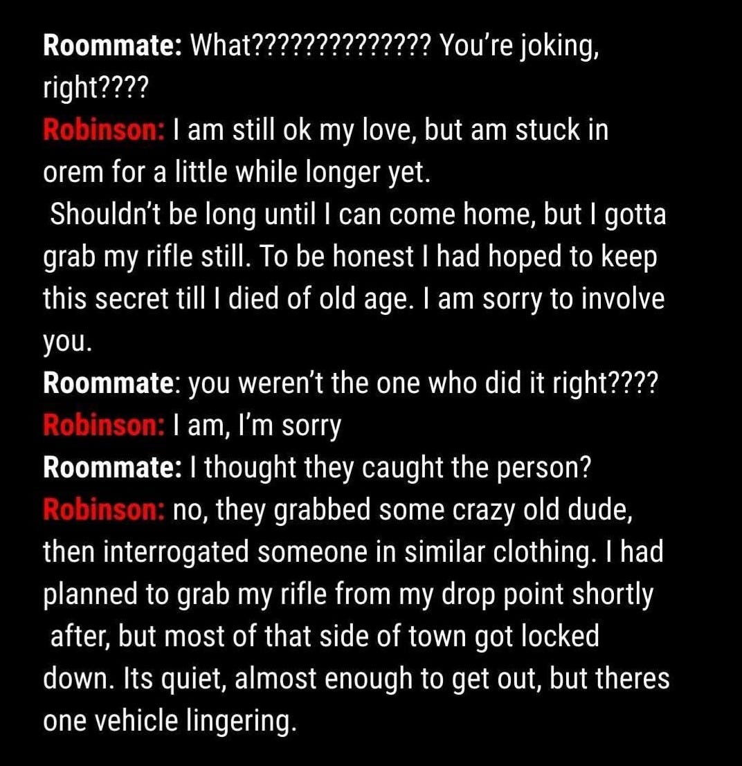 We have seen NO footage of Tyler with a gun of any kind - running on the roof or whatever - and he was actually kind of a nerd, afraid of guns and not a very good shot. There are also several accounts of him changing his clothes several times during the “assassination” which is extremely hard to believe. That’s also as hard to believe as the ridiculous text exchange with the “trans” BF named “Lance Twiggs” that the Utah authorities tried to sell us.