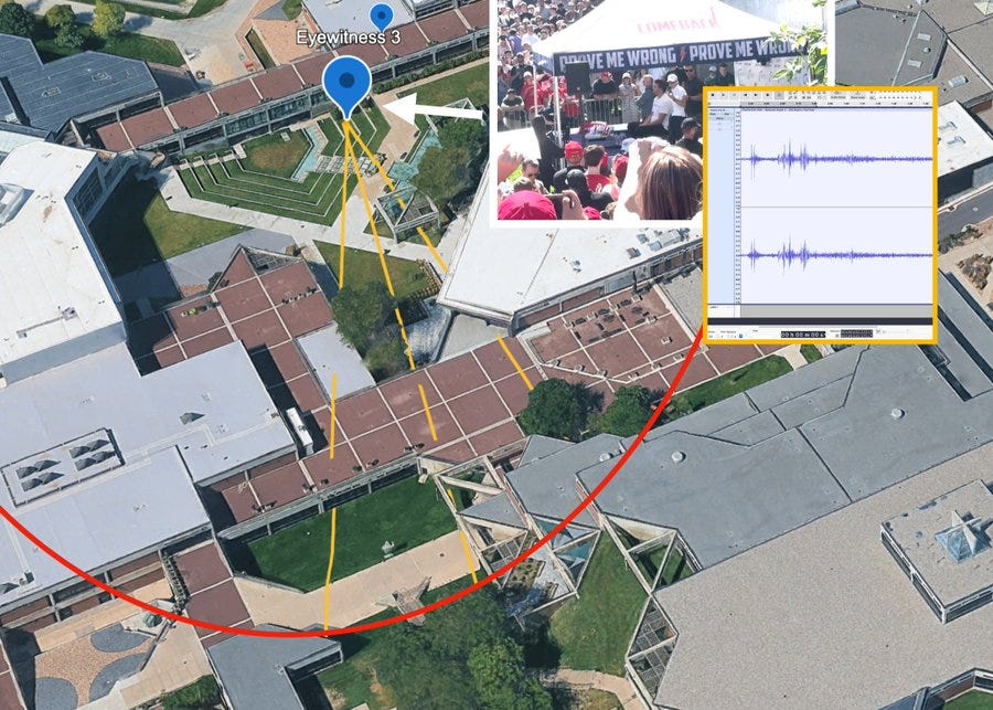 Cullen is reporting there were 4 drones in the area and he believes that's where the shot came from and he believes that the front wound was the entrance wound. Cullen said that depending on which camera-phone recording he uses, he’s getting from 75 to 150 yards out. Others say Charlie was possibly shot from the rear - overhead behind the ear - and the bullet when through his neck and down. Others say he was shot from his mic. In other words, NONE of the ballistics confirms anything.