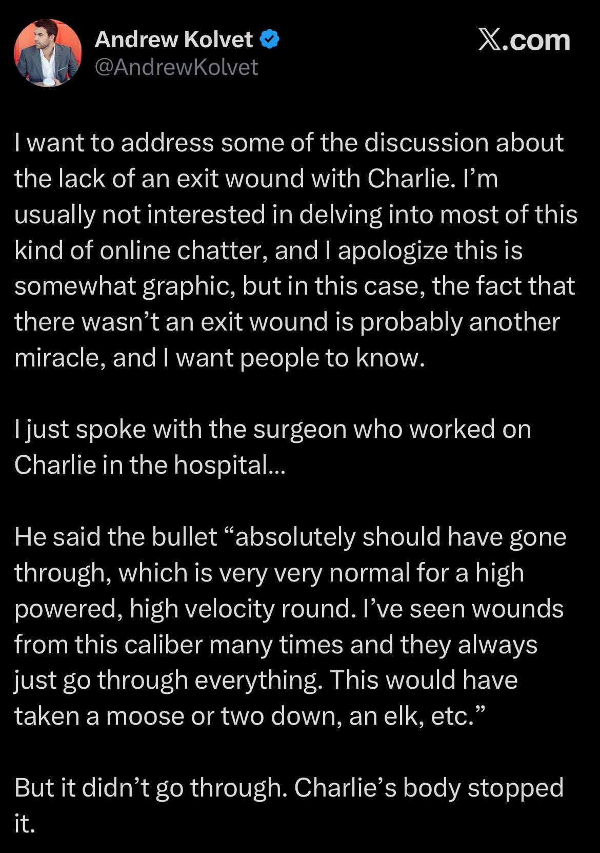 There are so many questions out there that TPUSA (Andrew Kolvet - who is Charlie’s executive producer and business partner) has been forced to respond to questions about why there was no exit wound on Charlie’s neck if he was shot in front.