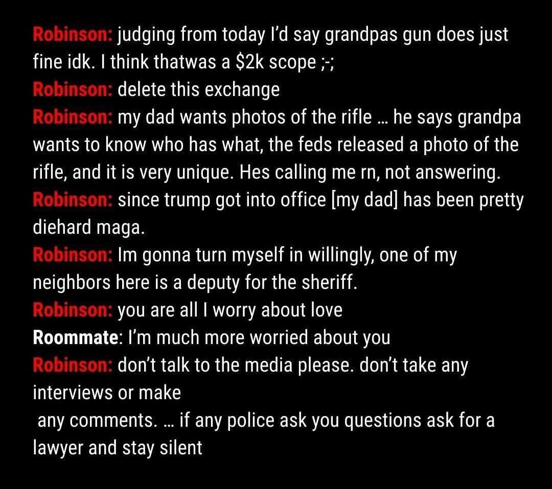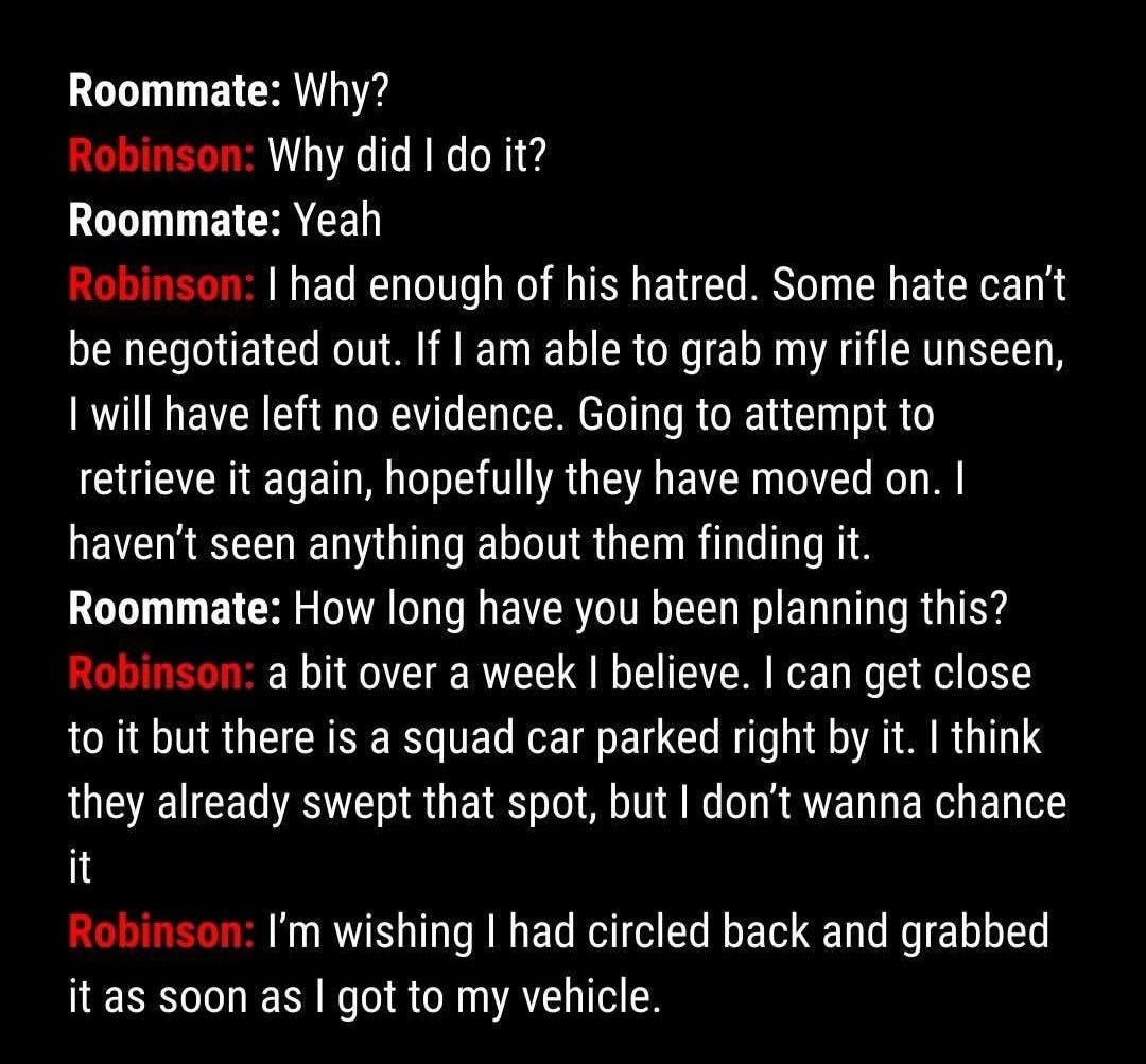 As part of the alleged killer’s getaway plan that included leaving as much incriminating evidence around as possible, Robinson – according to the FBI – sent a stream of text messages to his transgender roommate confirming that he committed the murder, mentioned his rifle, said he targeted Kirk because of his “hatred,” told the drop point of the rifle, said who he received the rifle from, talked about how he changed his outfits and admitted to etching meme-related messages into the bullets. Many have pointed out that if investigators were to contrive a statement as part of a cover-up, it would contain all of these points because the message is seemingly designed to get people to look the other way and stop asking questions.