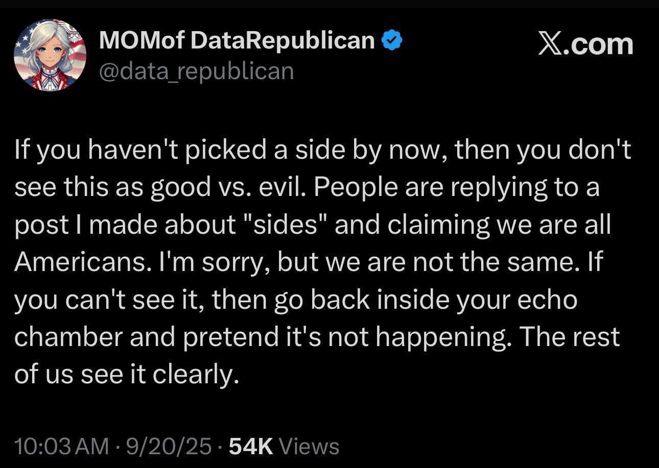 In other words - just because you love a certain pundit, doesn’t mean they are telling you the truth about who they think is behind Charlie’s murder. Look at ALL sides and ask yourself: WHO HAD THE MOST TO GAIN FROM THE DEATH OF PRESIDENT TRUMP AND CHARLIE KIRK AND WHO HAD THE MEANS, MOTIVE AND OPPORTUNITY TO DO IT WITHOUT GETTING CAUGHT.