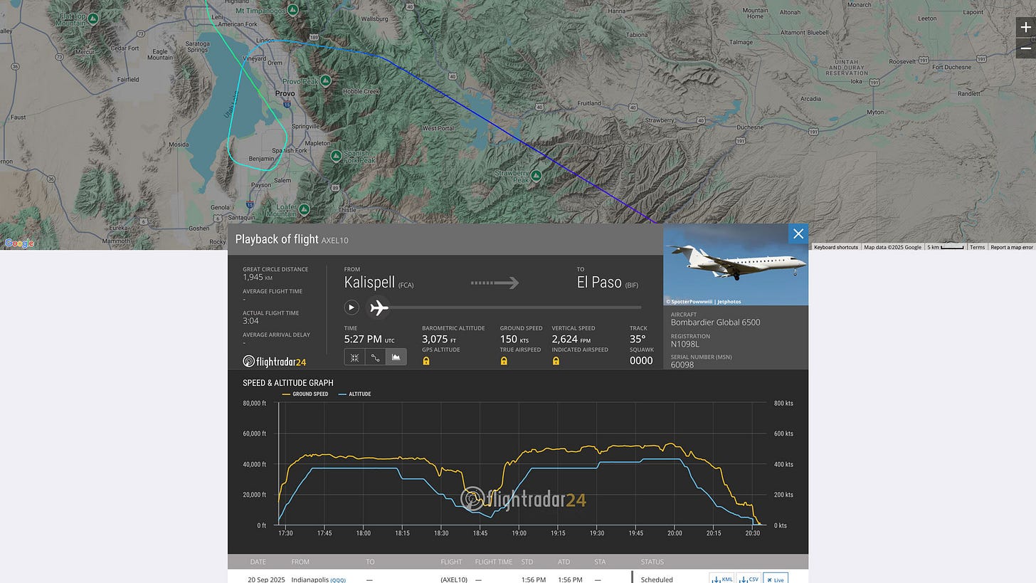 CULLEN: “Why was a HADES spy plane descending to 600' above Lake Utah, 3 hours before Charlie Kirk was killed? Why did the same aircraft return, 20 minutes after he was killed, and descend to 335', slowing to 118 knots? To pick up the UAVs that killed Charlie?”