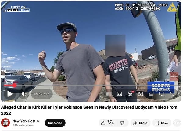 Back to the patsy, Tyler James Robinson. While the media paints Tyler as some kind of demon (who might not even exist) - here’s footage of Tyler, with his younger brother, was in a car accident three years ago in Utah, when he was 19, and his mother came to the scene to talk to the police. It's a bodycam video of that interaction that was just pulled by a news agency.